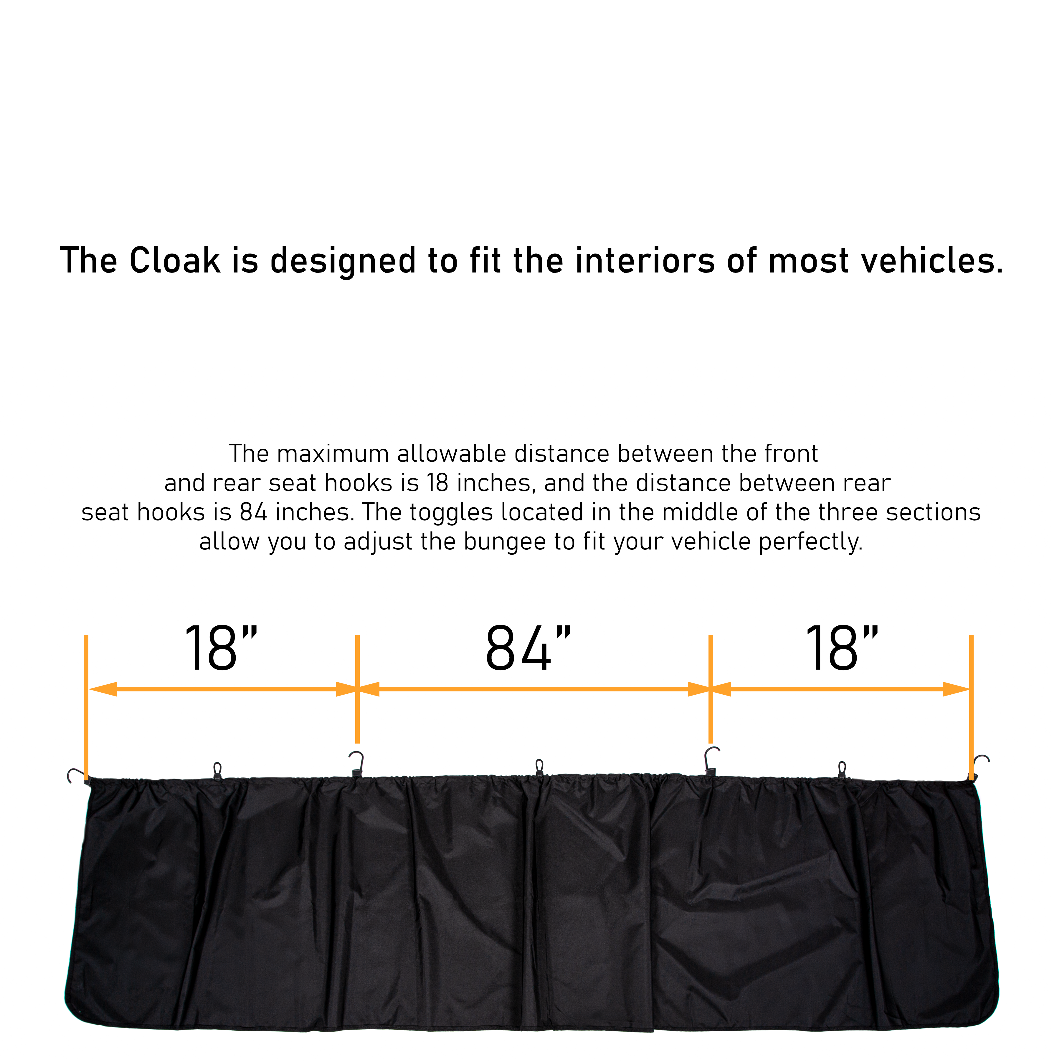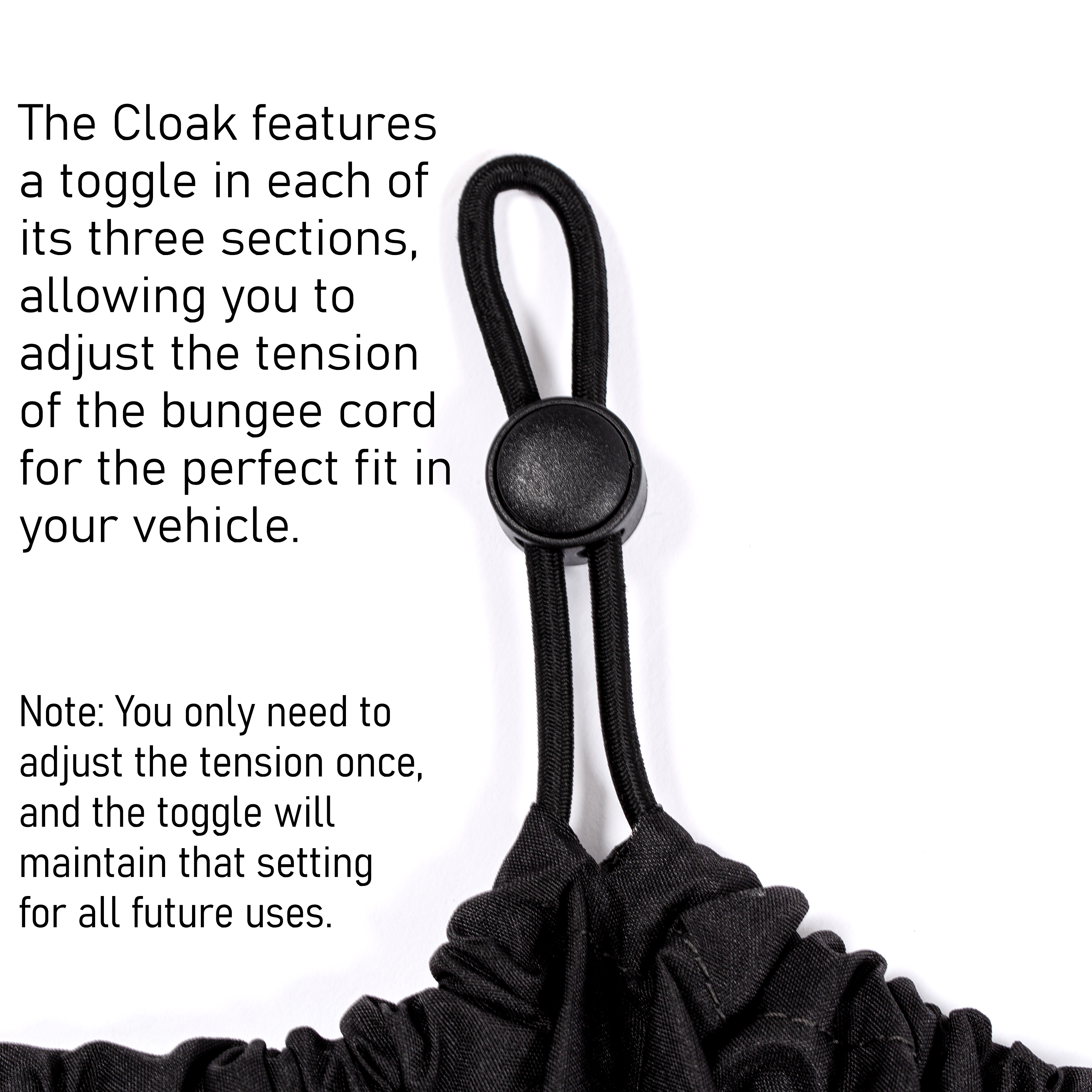 To achieve a perfect fit for your vehicle, toggles have been inserted on to the bungee line at three different points, allowing you to customize the length and tension. This ensures that after you set the perfect tension, each time you reattach The Cloak, it fits your vehicle perfectly.