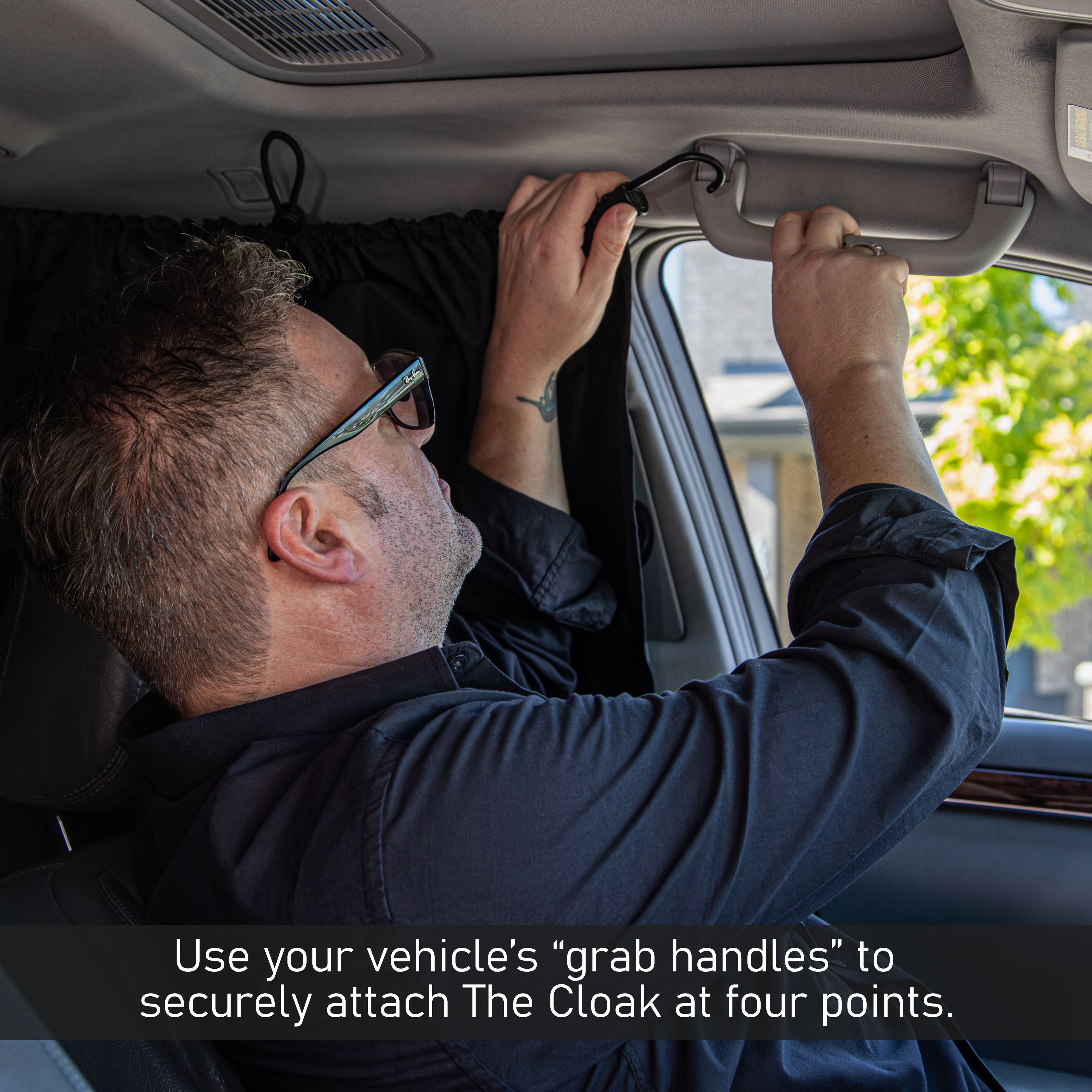 The Cloak is constructed from robust Oxford material that absorbs light rather than reflecting it, thus keeping the cabin area of your vehicle dim evening on the sunniest of days. It features a bungee cord threaded through it, with four hooks. To set up The Cloak inside your vehicle, simply attach the four hooks to the four grab handles. The bungee tension holds it firmly in place, blocking light from entering the vehicle through the rear windows.