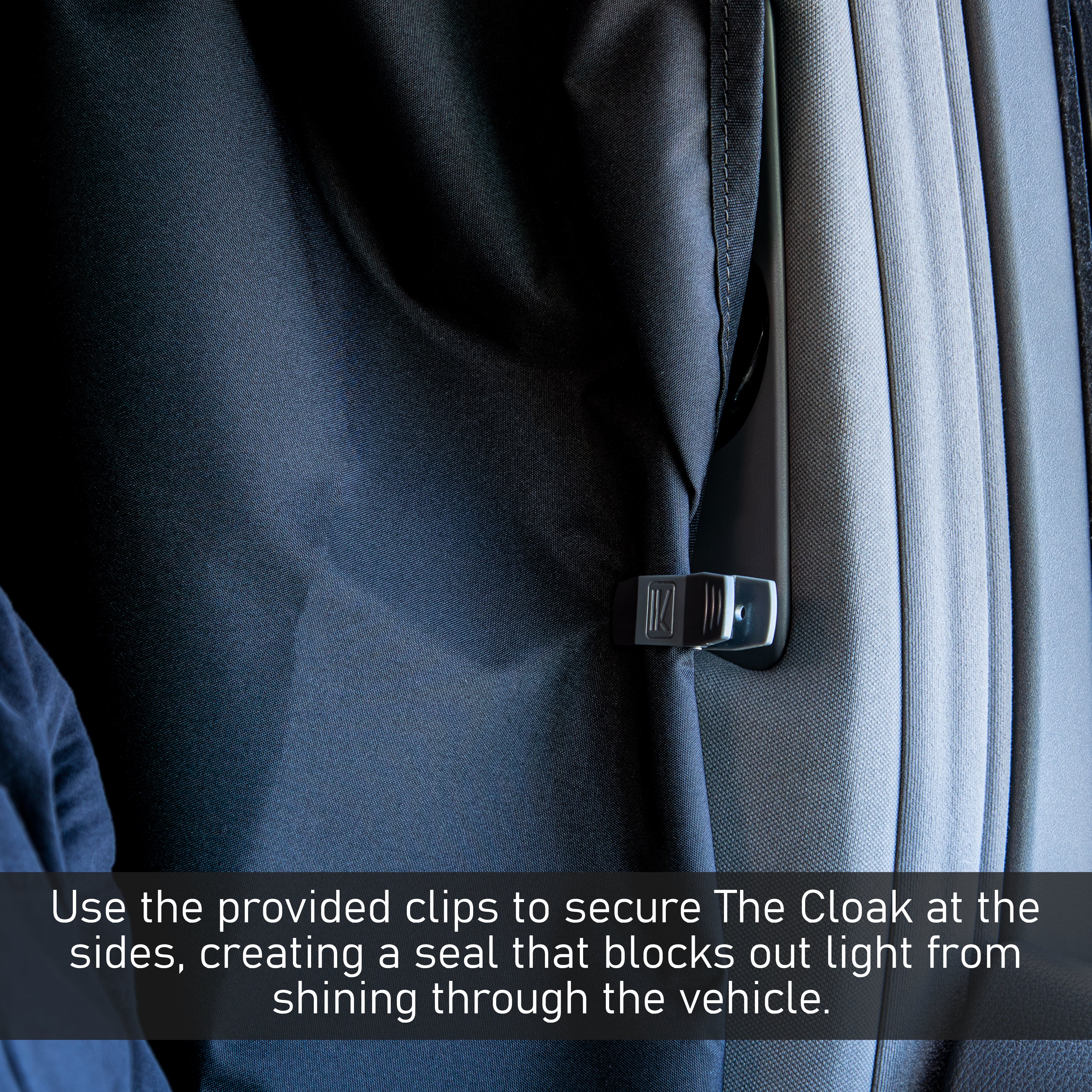 Two Clips are included to fasten the sides of the Cloak to the seat belts, creating a seal along the sides of the seats that prevents light from passing through.