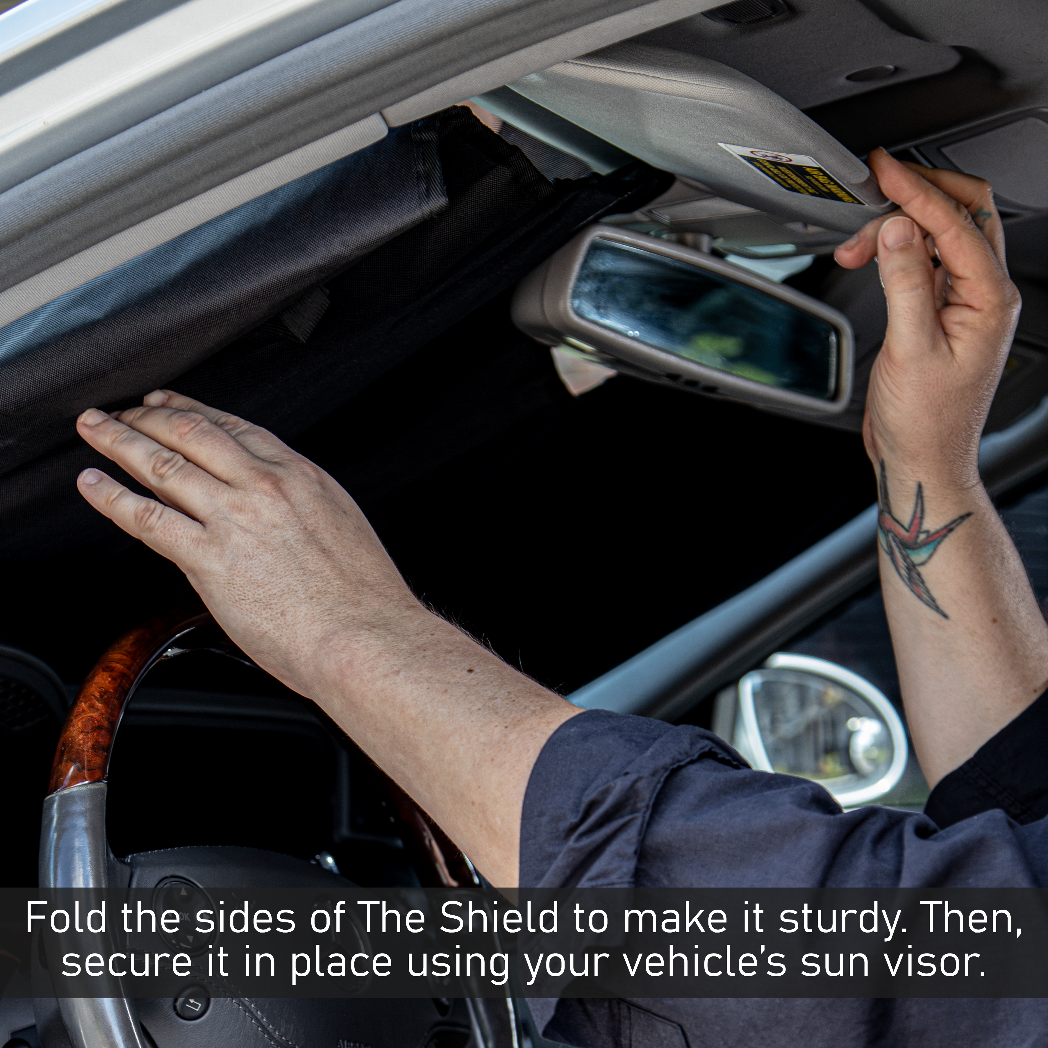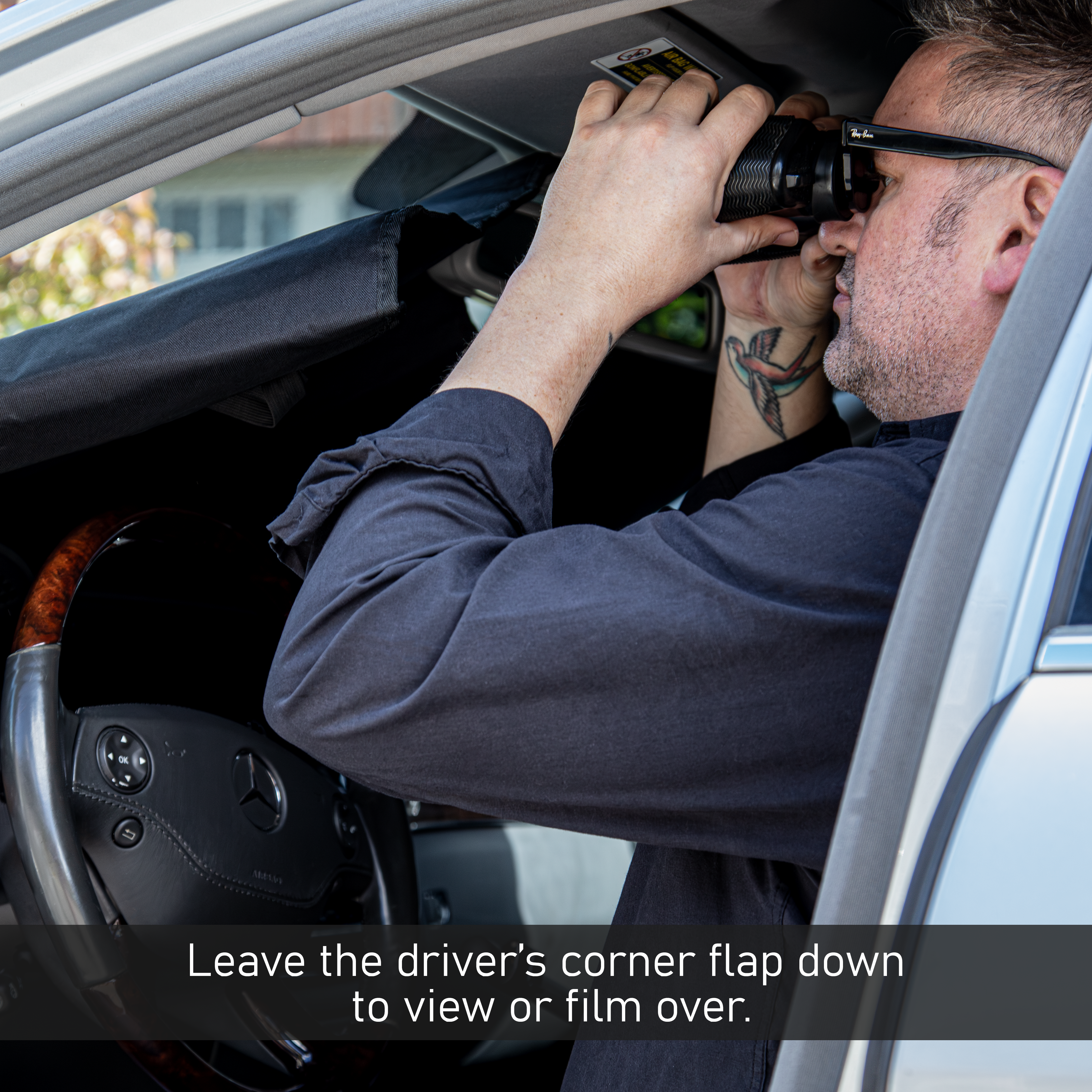 The Shield is constructed from durable Oxford material and gets securely held in place at the top by your vehicle’s sun visors and rearview mirror, while the sides are supported by folding them over. This design allows you to slightly lower a top corner, enabling you to discreetly film or observe through the front windshield while the Shield is in position.